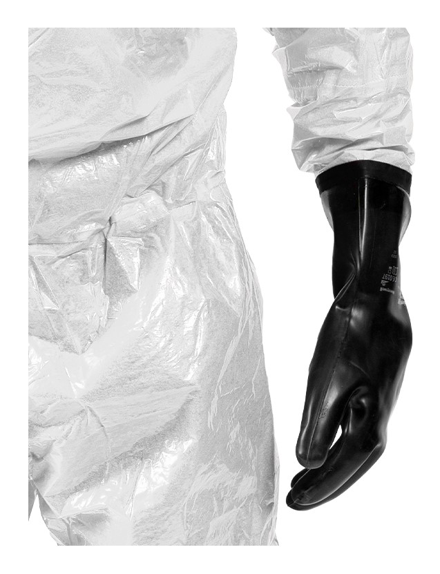 Fest angearbeitete anatomische KCL Butoject 898 Butylhandschuhe, welche auch bei Kälte hochflexibel sind und gute Ozon-, UV- und Temperaturbeständigkeit bieten, runden den Anzug ab. Der Handschuh ist gasundurchlässig und beständig gegen viele Säuren, Laugen, Lösungen, Alkohole, Ester, Weichmacher und Ketone.