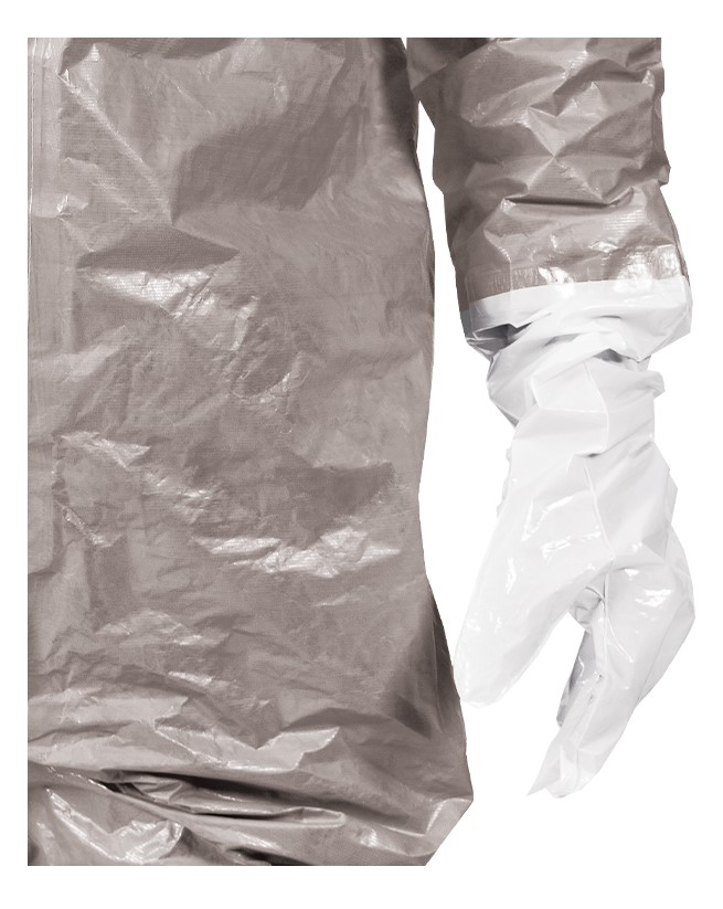 Fest angearbeitete ANSELL Barrier Laminathandschuh mit Schutzstulpe runden den Anzug ab und bieten eine anatomische Passform, sowie Schutz vor einem äußerst breiten Spektrum von Chemikalien und Flüssigkeiten.