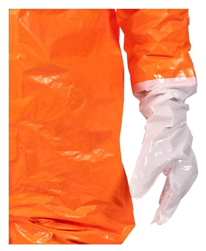 Fest angearbeitete ANSELL Barrier Laminathandschuh mit Schutzstulpe runden den Anzug ab und bieten eine anatomische Passform, sowie Schutz vor einem äußerst breiten Spektrum von Chemikalien und Flüssigkeiten.