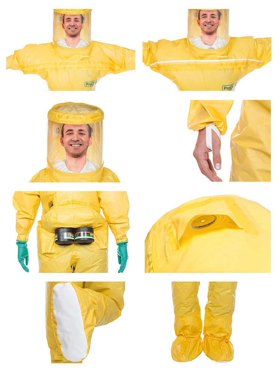 Der Vollschutzoverall ProChem® III wird mit Gebläseatemschutz (PAPR Unit) betrieben, der kontaminationsfrei unter dem Overall getragen wird. Die doppelte Abdeckblende des Fronteinstiegs wird per Wickelblende verschlossen. Gummizüge an Ärmeln und Beinen sowie ein Taillengummi sorgen für eine optimale Passform und der großzügig geschnittene Schrittbereich für optimale Bewegungsfreiheit. Das Panoramavisier ermöglicht eine perfekte Rundumsicht und bietet genügend Platz für Helme oder Kommunikationssysteme. Das Gebläse ermöglicht lange Einsätze und gute Luftverteilung durch Ausatemventile.