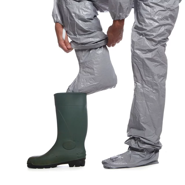 DuPont™ Tychem® 6000 F mit ableitfähigen Socken. Anzug mit Kapuze. Angearbeitete Socken und Stiefelstulpen. Überklebte Nähte. Daumenschlaufen. Gummizüge an Armabschlüssen, an der Kapuze und in der Taille. Selbstklebende doppelte Reißverschlussabdeckung und Kinnabdeckung. Grau.