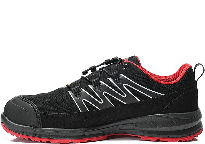 Der Marten XXSports Pro black Low ESD S3 fällt direkt ins Auge. Das schwarz-rote Design in Sneaker-Optik überzeugt aber nicht nur durch sein Äußeres. So verfügt der ESD-fähige Sicherheitshalbschuh über eine Zehenschutzkappe aus Stahl und einen metallfreien Durchtrittschutz. Er sitzt dank seines Obermaterials aus hydrophobiertem Mikrofaser- und Textilmaterial leicht am Fuß und hat im Sohlenkern das Material Infinergy® von BASF verarbeitet. Die SRA-zertifizierte WELLMAXX SPORTS Sohle aus TPU/PU hat dadurch eine besonders gute Dämpfung, sodass ein Großteil der aufgewendeten Energie beim Laufen wieder an den Träger zurückgegeben wird. Dazu hat der Schuh aber noch weitere Eigenschaften, die den Komfort merklich erhöhen. Das atmungsaktive Textilfutter sowie die gepolsterte Lasche sorgen für das Wohlbefinden des Fußes. Das elastische Schnürsystem mit Schnellarretierung ist praktisch und bequem.