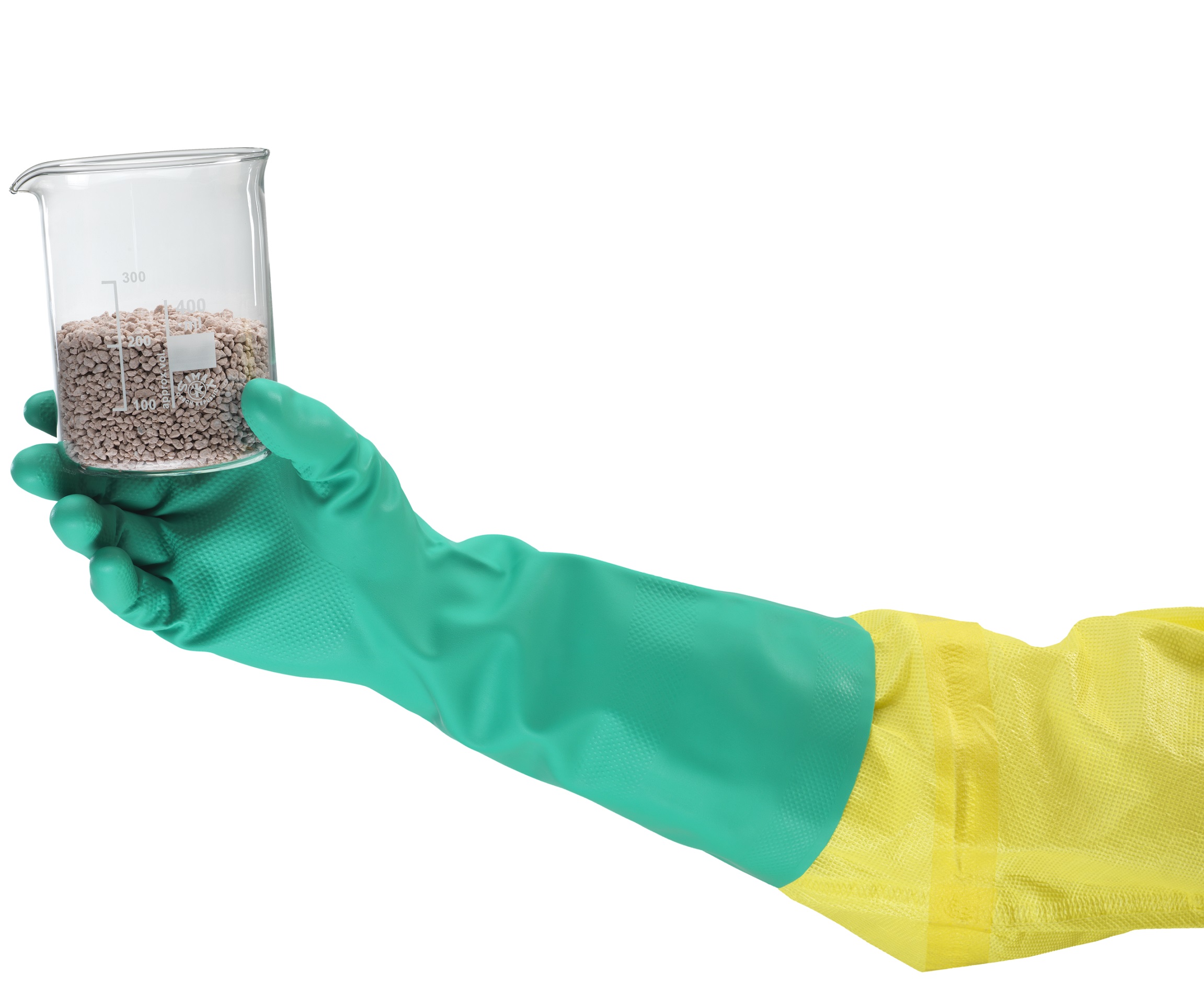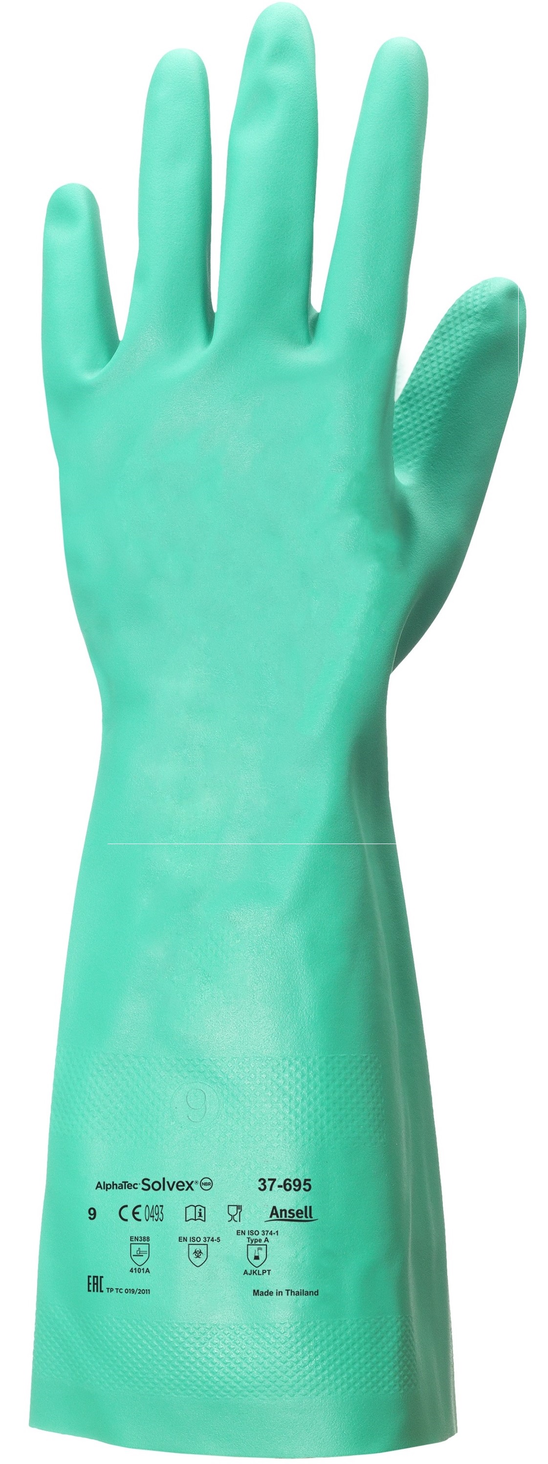 Ansells Nitrilhandschuhserie Sol-Vex® ist in einer großen Auswahl an Längen, Wandstärken, Größen und Innenausstattungen erhältlich. Sol-Vex® erzielt optimale Ergebnisse in trockenen und nassen Arbeitsbereichen, in denen ein erstklassiger Chemikalienschutz entscheidend ist. Dieser wieder verwendbare Handschuh bietet mit seiner einzigartig hohen Abriebfestigkeit einen bemerkenswerten Tragekomfort. Die Sol-Vex®- Nitrilhandschuhe sind die ideale Wahl für den sicheren Umgang mit aggressiven Chemikalien. Das Innenfutter aus Baumwollvelour bietet dem Anwender in Verbindung mit der Flexibilität und Beweglichkeit des Ansell Nitrilkautschuks einen außergewöhnlichen Tragekomfort. Sein Rautenfinish erhöht die Griffsicherheit. Das Hammerschlagprofil des Sol-Vex® reduziert durch seine griffige Oberfläche den Ausschuss von empfindlichen Teilen durch Beschädigung und damit die indirekten Kosten. Das Modell Sol-Vex® (37-695) ist länger (38 cm) als die Standardausführung und schützt zusätzlich das Handgelenk und den Unterarm.
