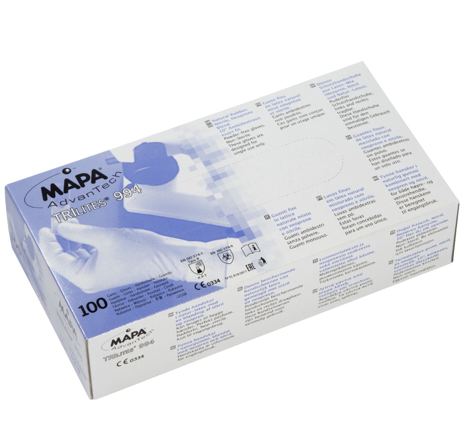 Der Mapa Trilites 994 ist ein einzigartiger Handschuh dank exklusiver Tri-Polymer-Mischung: Kombiniert Vorteile von Naturlatex, Neopren und Nitril. Elastisch, reißfest und erhöhte Resistenz gegen Chemikalienspritzer. Hoher Komfort durch Flexibilität und gute Passform. Gekörnte Fingerspitzen für optimierte Griffigkeit. Hervorragende Fingerfertigkeit, ausgezeichnetes Tastempfinden. Kein Schutz vor mechanischen Risiken. Anwendung: Für Laborarbeiten, Leuchtmittel- Montage, Behandlung von Präzisionsteilen.