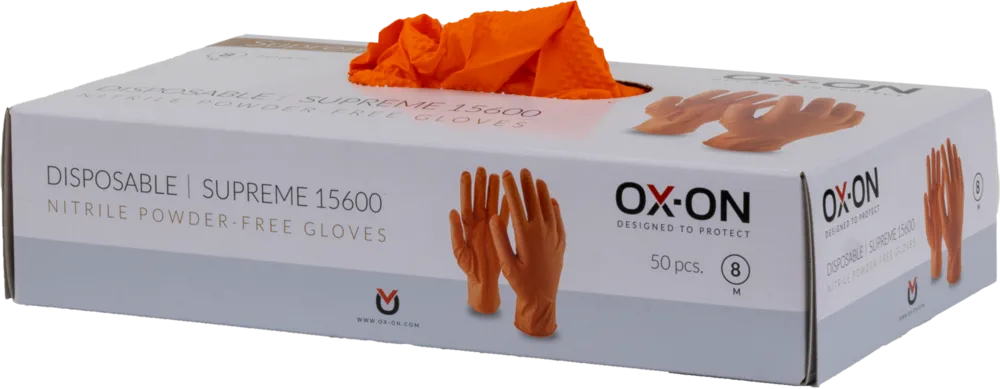 OX-ON Disposable Supreme 15600 sind orangefarbene, puderfreie Einweghandschuhe aus extra starkem Nitril, mit Minipunkten, die die Haltbarkeit erhöhen. Äußerst bequeme, elastische Einweghandschuhe, die sich zu 100 % an die Handform anpassen. Einsetzbar z. B. für den Umgang mit Lebensmitteln, für Reinigungsarbeiten, für Arbeiten in der Werkstatt und für Laborarbeiten. Der Handschuh ist hypoallergen, da er kein Latex enthält. Disposable Supreme 15600 sind besonders robuste, langlebige Einweghandschuhe. 50 Stk. pro box. Gewicht: 6,5 Gramm Dicke: Handfläche: 0,18 mm (+/- 0,03) Finger: 0,20 mm (+/- 0,03) Manschette: 0,08 mm (+/- 0,03)