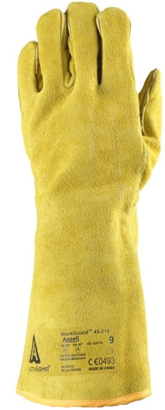 Der ActivArmr WorkGuard™ 43-216 ist ein Spezialhandschuh für Schwerarbeiten mit hohem Schutz vor Schmelzmetallspritzern. Ideal auch als vielseitiger Hitzeschutz. Hervorragende Haltbarkeit und sehr guter Schutz vor Schnitten, Abrieb und Durchstechen. Hitzeschutz in vielen Arbeitsbereichen. Er ist ein Hitzeschutzhandschuh der Kategorie III und erfüllt die Leistungsstufen 413X4X gemäß EN 407. Dadurch eignet sich dieser Handschuh für ein breites Spektrum von Einsatzbereichen, die einen Hitzeschutz erfordern, wie Schweißarbeiten, Maschinenführung und Arbeiten in einer Umgebung mit einer Gefahr durch Schmelzmetallspritzer. Das weiche Innenfutter der Handfläche aus Jersey und die Stulpe mit Innenfutter aus Baumwoll-Denim verleihen ihm seinen hohen Tragekomfort. Exzellente Robustheit für einen wirksamen Mechanikschutz. Robuster Lederhandschuh für hohe Belastungen. Verstärkte Innenhand für noch mehr Abriebfestigkeit. Kevlar®-Nähte, mit Rindsleder verstärkt. Diese Ausführung gewährleistet einen überragenden Mechanikschutz.