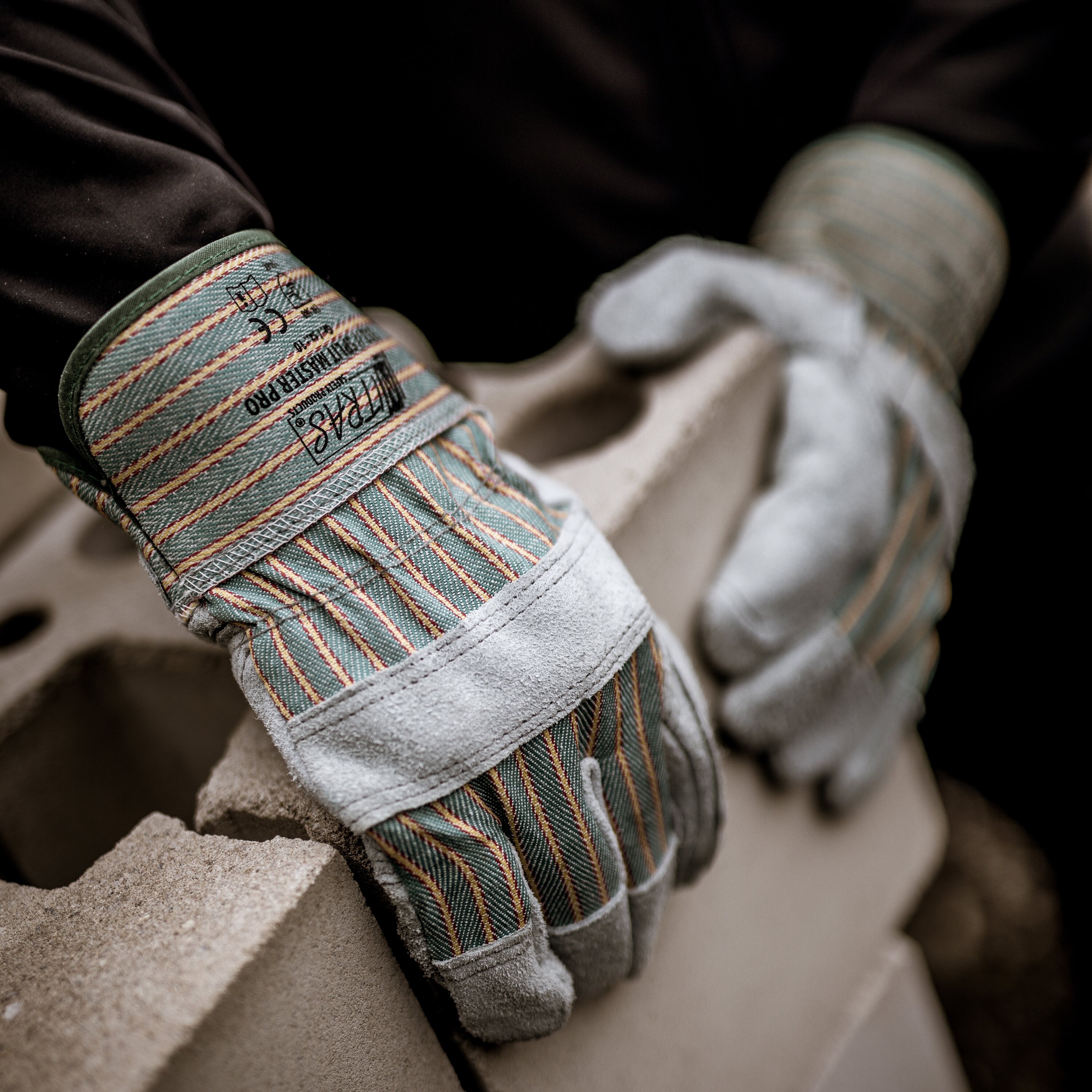 NITRAS SPLIT MASTER PRO, Rindspaltlederhandschuhe, grün / rot / gelb gestreifter Baumwoll-Rücken, Innenhandfutter, gummierte Stulpe, Doppelnähte, verstärkt durch großen Innenhandbesatz aus Spaltleder inkl. Daumen und Zeigefinger, TÜV/GS-zertifiziert.