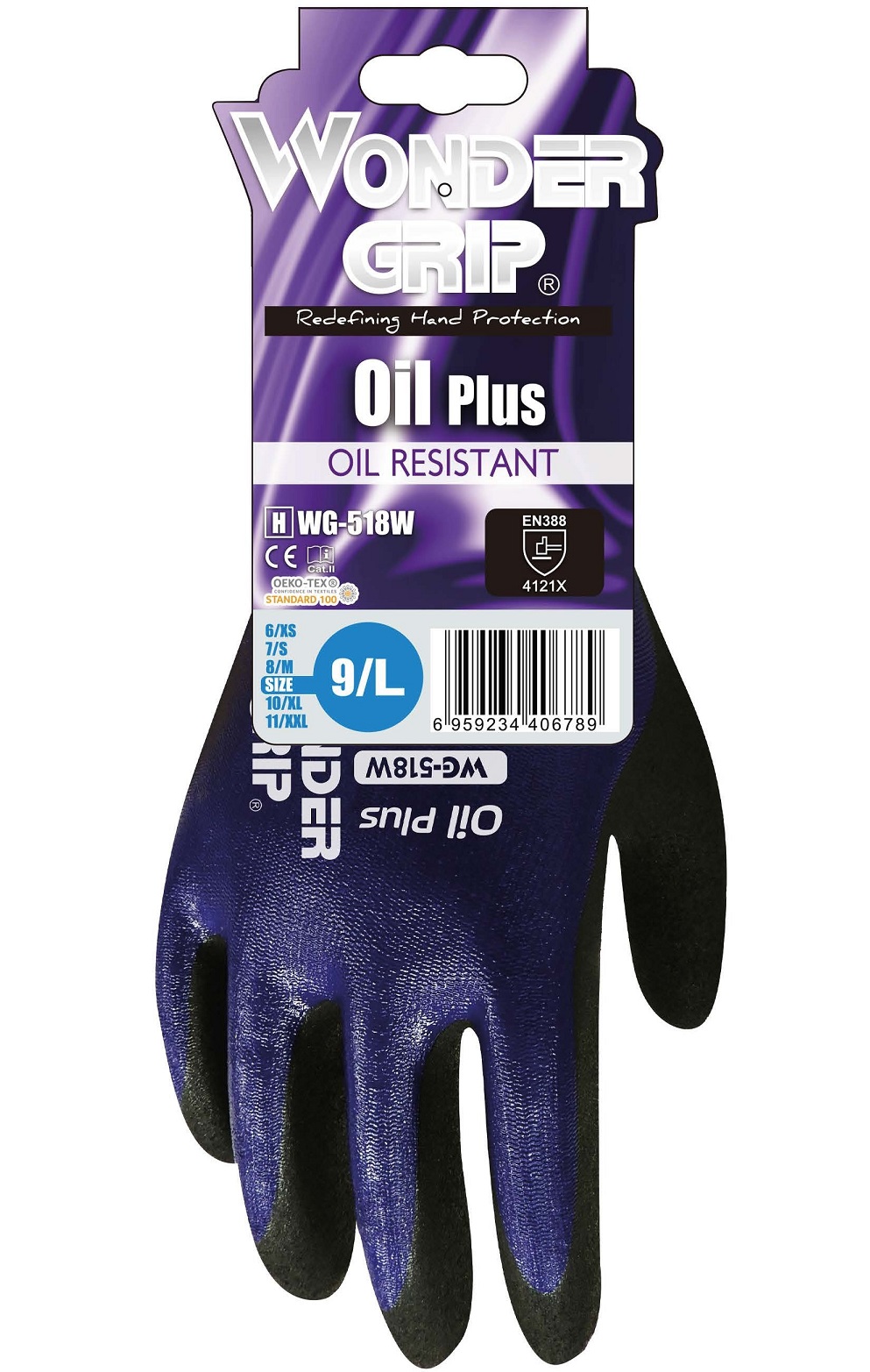 Der WG-518W Oil Plus ist ein Handschuh mit vollständiger und doppelter Nitrilbeschichtung und einem 15-Gauge Nylonfutter. Dank der Wonder Grip Technology™ gewährleistet die Beschichtung außergewöhnliche Griffigkeit und Widerstandsfähigkeit in trockener oder nasser Umgebung. In Kombination mit der doppelten Nitrilbeschichtung gewährleistet die Wonder Grip Technology ™ einen hervorragenden Schutz bei der Arbeit mit nassen, fettigen oder öligen Elementen. Die doppelte Beschichtungstechnologie sorgt für Haltbarkeit und hohe Abriebfestigkeit, während die einzigartige weiche Oberfläche große Fingerfertigkeit und Flexibilität bei minimaler Ermüdung der Hand ermöglicht.