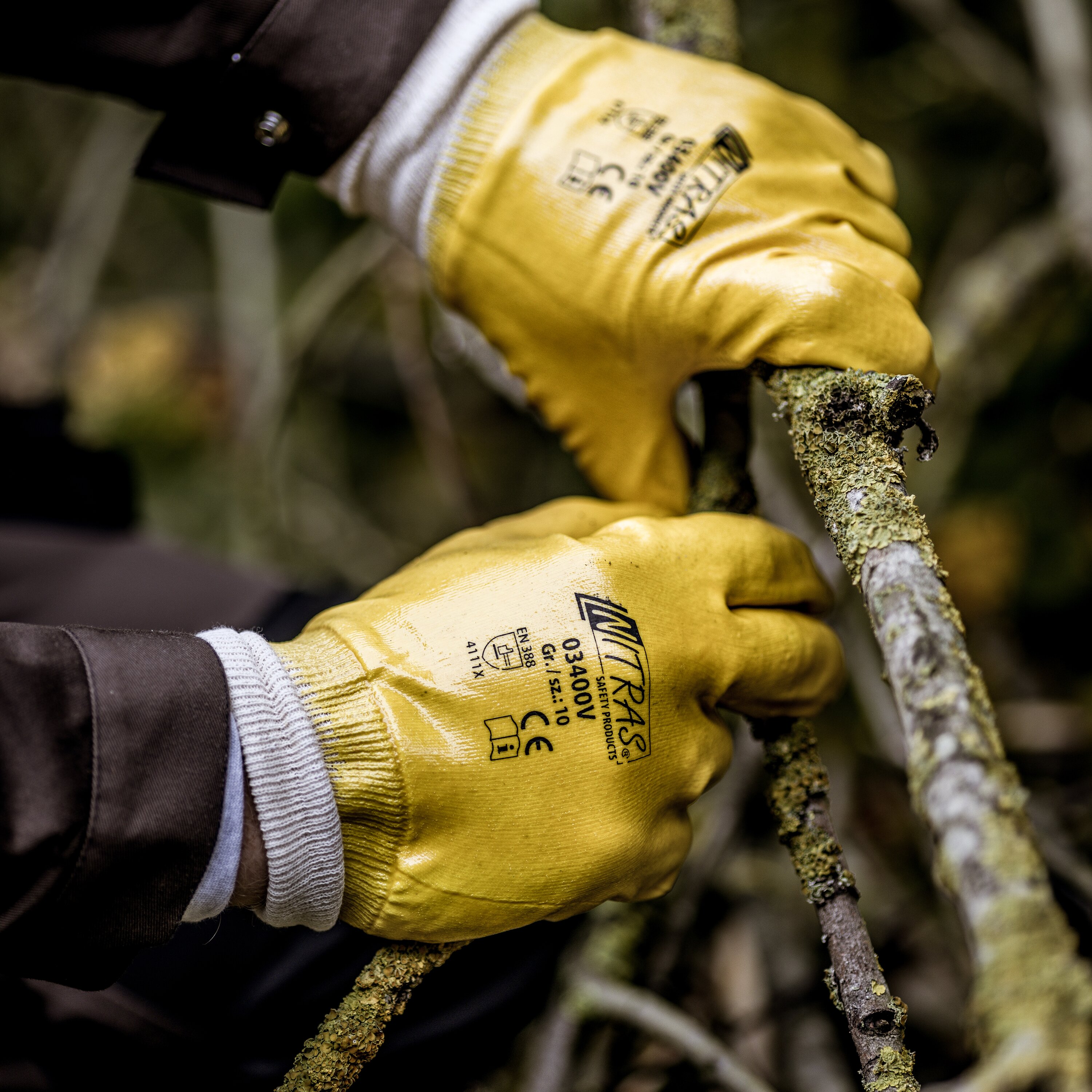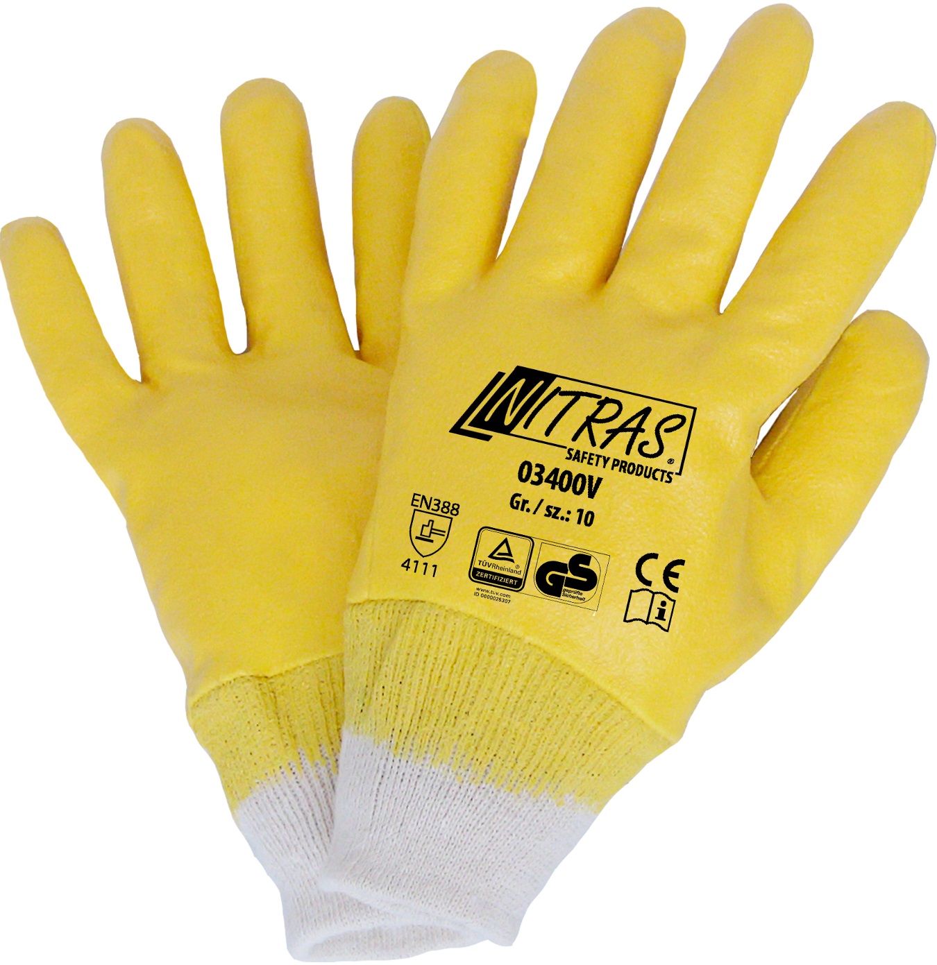 Die Nitras Nitrilhandschuhe sind rohweiß mit einer Nitrilbeschichtung. Der Handschuh ist vollbeschichtet und gelb.