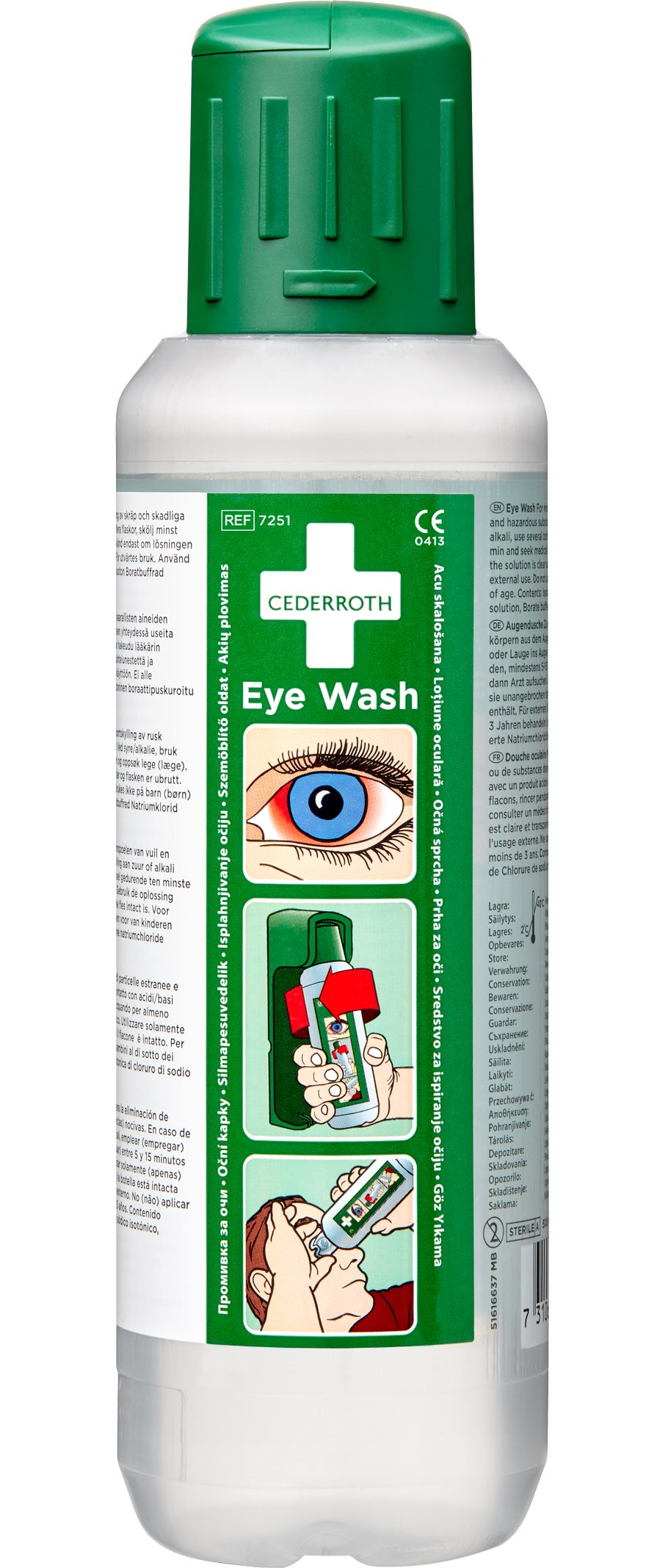 Die Cederroth Augenspüllösung gleicht den pH-Wert im Auge aus, d. h. sie neutralisiert Alkali- und Säurespritzer. Dabei wirkt sie schneller als herkömmliche Kochsalzlösung. Die Wirkung ist bei Alkalien generell stärker als bei Säuren. Haltbarkeit: Beeindruckende 4,5 Jahre. Bei Unfällen mit kalkhaltigen Stoffen (z. B. Zement, Beton oder Kalk) kann die Cederroth Augendusche unbesorgt zum Spülen eingesetzt werden: für eine optimale Spülung ist die Augenspüllösung 100% phosphatfrei.