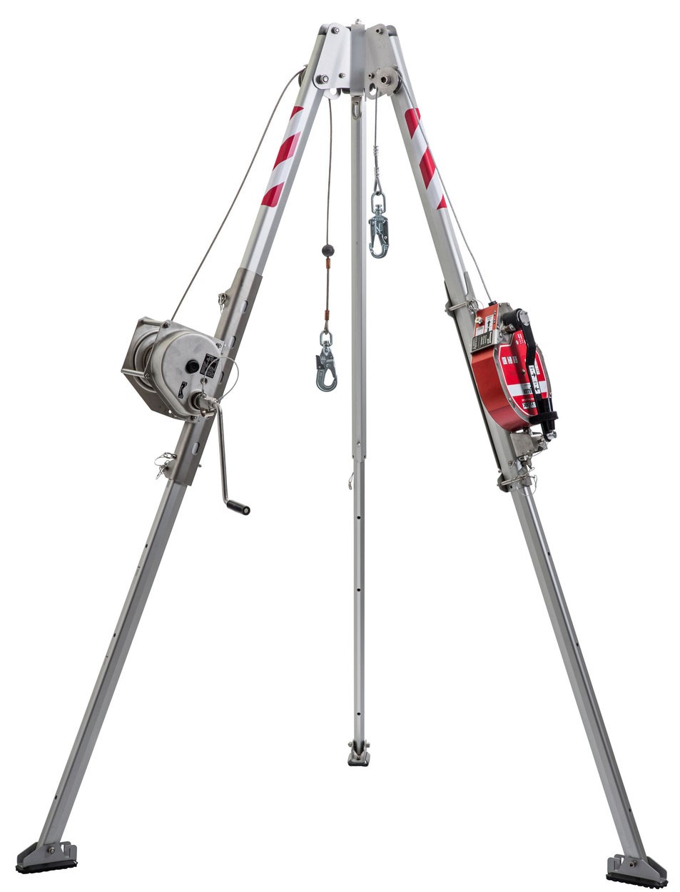 3pod Dreibaum +MightEvac 15m verzinktes Drahtseil + Halterung. Leicht zu tragen und zu transportieren (ergonomisches Profil der Beine für Griffigkeit). Einfach und sicher zu installieren (alle Beine klappen gleichzeitig aus, 1 Knopf, mit dem alle Beine zugleich festgestellt werden). Getestet für 2 Personen.