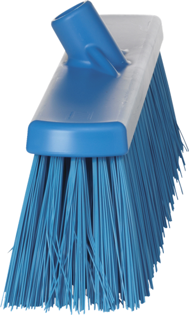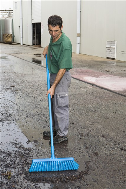 Besen mit langen, dicken Filamenten. Eignet sich z.B. für die Entfernung von großen Abfallprodukten vom Fußboden, vor der Reinigung oder während der Produktion in der Fleisch- und Fischindustrie. Macht die Reinigung effizienter. Einfach zu reinigen.