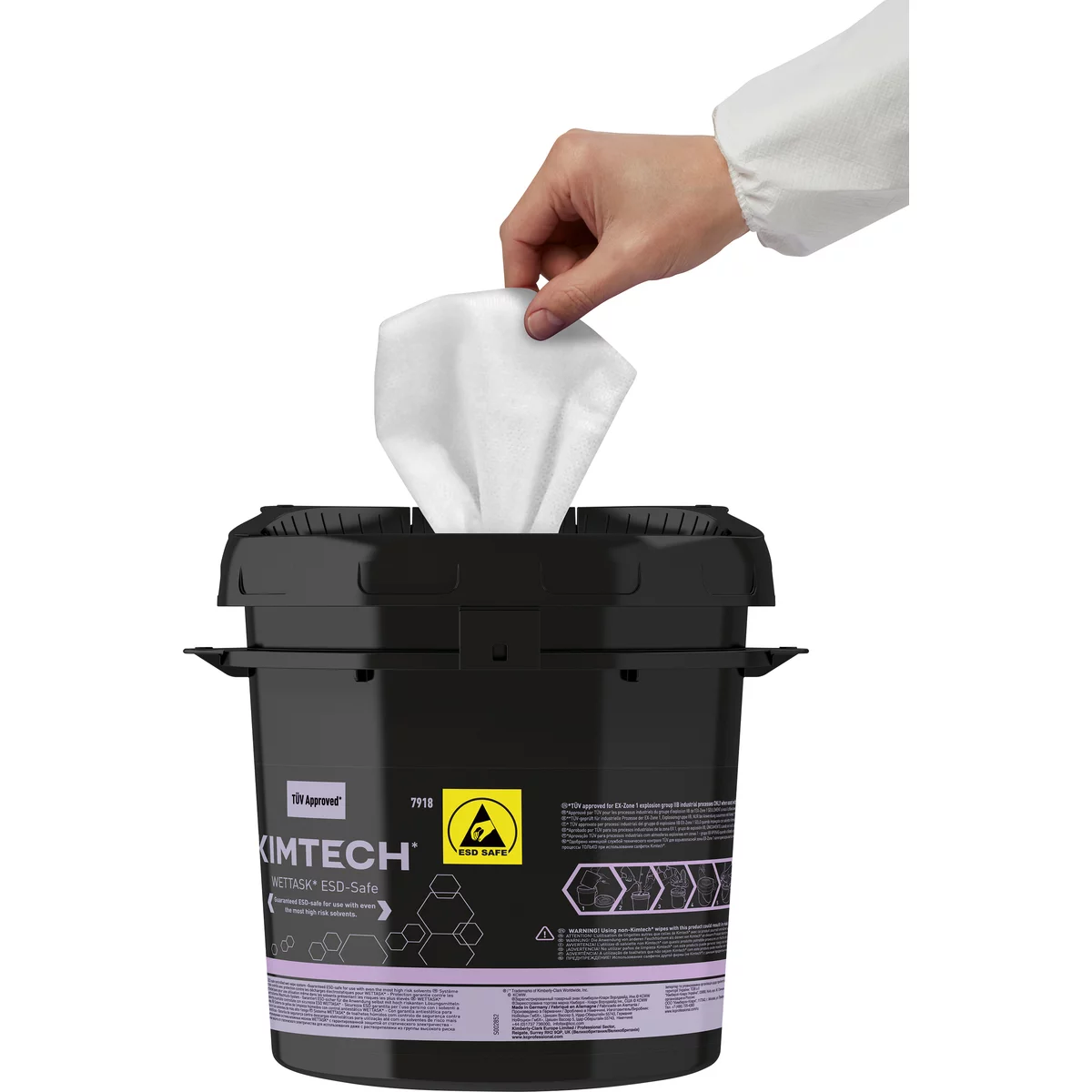 Das ESD-sichere Feuchtwischsystem Kimtech® Wettask™ bietet erstklassigen Schutz für Prozesse in ESD-sensiblen und explosionsgefährdeten Bereichen. Das System wurde zur Nutzung in ESD-sensiblen Bereichen zertifiziert und ist TÜV-geprüft für industrielle Prozesse der EX-Zone 1, Explosionsgruppe IIB,NUR bei Anwendung zusammen mit Kimtech Wischtüchern. Ein luftdichtes Wischsystem mit abnehmbaren Deckel zum praktischen Nachfüllen und ein separater Deckel in der Mitte zur einfachen, kontrollierten Wischtuchentnahme. Für den Einsatz mit hochaggressiven Lösungsmitteln geeignet. Der Spender kann mit allen Kimtech® Wettask™ Wischtüchern verwendet werden.