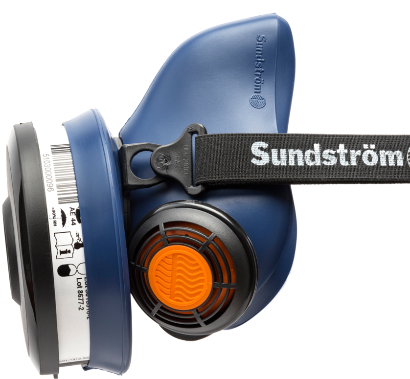 Die Halbmaske SR 100 wird aus Silikon hergestellt und ist in drei Größen S/M, M/L und L/XL erhältlich. Die Maske ist mit zwei Ausatemventilen ausgestattet, die sich durch äußerst geringen Atemwiderstand auszeichnen. Die Ventilkappen mit Abschirmer schützen die Ausatemmembrane gegen Staub und Farbpartikel. Material und Farbpigmente des Maskenkörpers sind für Lebensmittel zugelassen (FDA und BGA), so dass die Gefahr von Kontaktallergien auf ein Minimum beschränkt wird. Die einfach verstellbaren Tragebänder stellen eine V-Schleife dar und besitzen eine große schalenförmige Kopfplatte, die eine bequeme und sichere Einstellung ermöglicht. Die Maske wird entweder als Filterschutz in Kombination mit Filtern aus dem Sundström-Sortiment eingesetzt oder in Verbindung mit Druckluftzusatz SR 307 in ein Atemgerät mit kontinuierlichem Luftstrom für Anschluss an Druckluft umfunktioniert. Halter für Vorfilter sind in der Lieferung enthalten. Aufbewahrung am besten in Box SR 230 bzw. Aufbewahrungstasche SR 339.