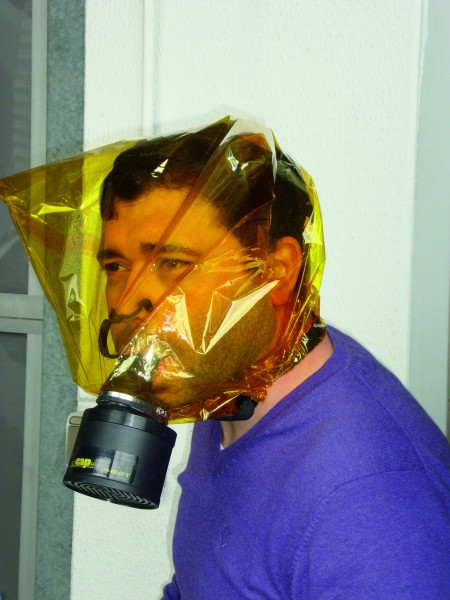 - bestehend aus einer auffällig gelben Haube mit uneingeschränktem Blickfeld, stufenlos verstellbarer Halskrause, Filter sowie einer Mundstückgarnitur